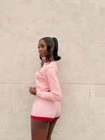 The matching high-waisted shorts are finished with contrasting red ribbed trim. Breathable yet warm, this set is perfect for transitioning from lounging at home to stepping out in style.