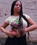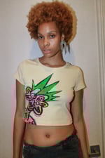 A cropped SAIbysai baby tee with Multi-color SAIbysai art screen printed to the front
